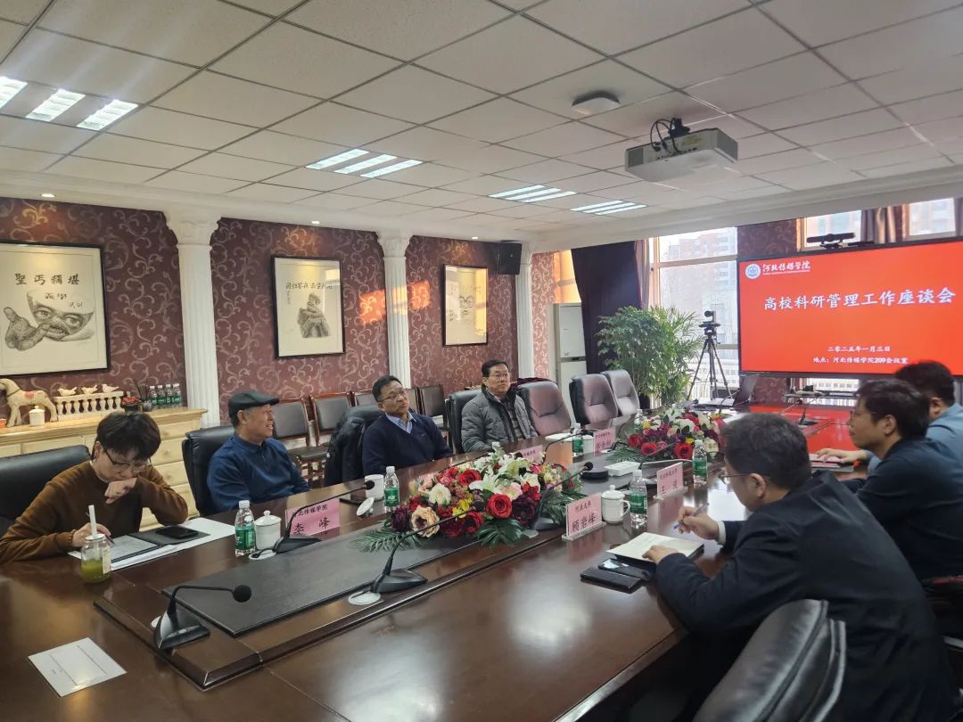 2025年1月3日,我校邀请河北大学科研处副处长顾岩峰、河北科技大学科研处处长王波和河北中医药大学科研处副处长李斯,在兴安校区召开高校科研管理工作座谈会。会议由副校长李建平致辞、科研处处长董孟怀主持,新闻传播学院院长张金桐、副院长朱良志以及影视艺术学院副院长李峰等参加座谈会。