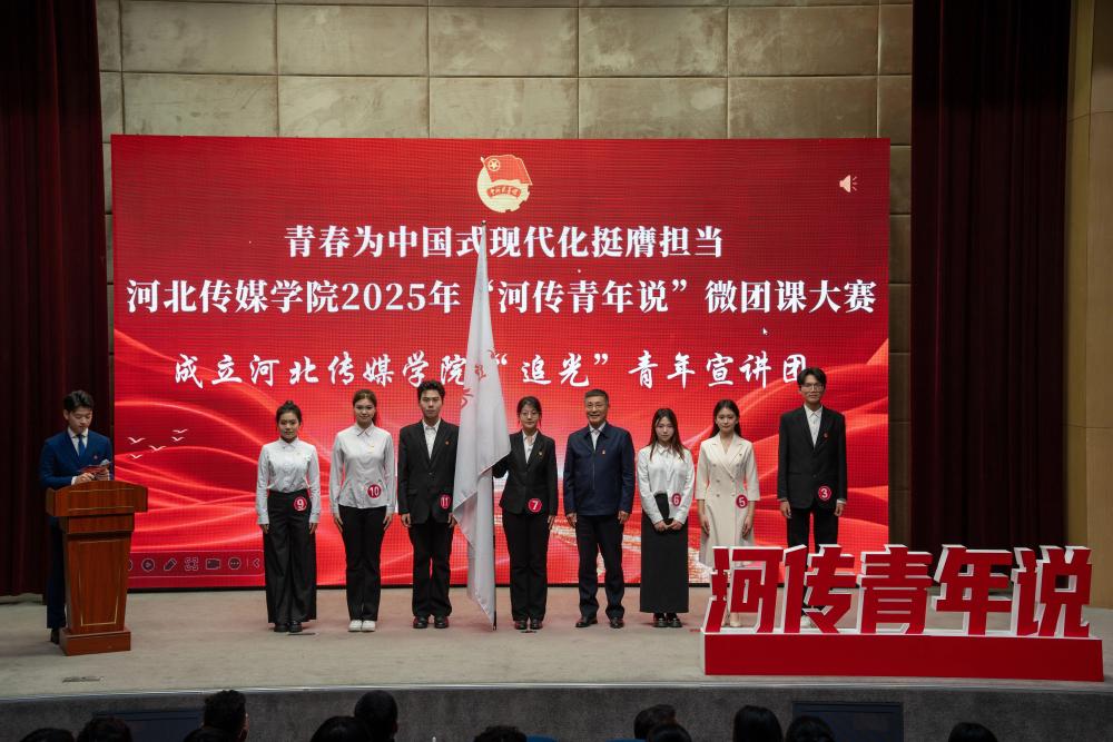 决赛现场,选手们以多元视角讲述奋进中国的时代故事。经过激烈角逐,大赛最终评出一等奖1名、二等奖2名、三等奖3名及优秀奖5名,并对组织得力的先进单位予以表彰。为延伸赛事育人实效,推动理论宣讲持续深化,决赛现场正式成立了河北传媒学院“追光”青年宣讲团,高晓峰副校长为宣讲团授旗。该宣讲团以本次大赛获奖选手为核心骨干,将深入班级、社区与实践一线,持续开展理论宣讲,努力成长为一支传播创新理论的“青年先锋队”。