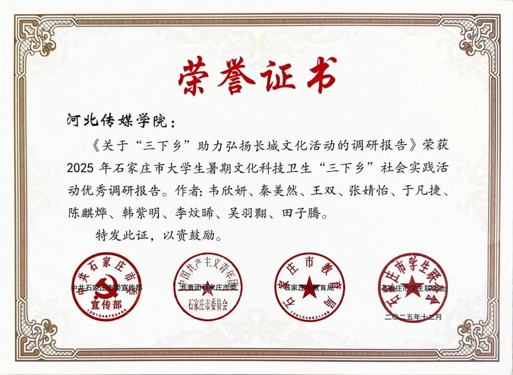 近日,《河北省教育厅关于公布2025年暑期河北省大学生“体验省情·服务群众”主题实践活动结果的通知》发布,全省共评选出优秀调研报告100篇,我校《河北省青年友好型省份建设调研报告》获评“优秀调研报告”。此外,我校被中共石家庄市委宣传部、共青团石家庄市委、石家庄市教育局、石家庄市学生联合会等部门授予“2025年石家庄市大学生暑期文化科技卫生‘三下乡’社会实践活动优秀组织单位”荣誉称号,20支实践团队获评“先进团队”、29名教师获评“优秀指导教师”,20名学生荣获“先进个人”,《关于“三下乡”助力弘扬长城文化活动的调研报告》获评“优秀调研报告”。