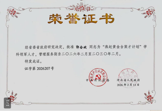 郭会斌教授始终以学科建设为核心,牵头推动学院学科布局优化、科研平台建设与人才队伍培育,带领全院教职工凝心聚力、锐意进取,推动学院在教学、科研、社会服务等方面取得显著成效,为区域经济社会发展与相关行业进步提供了有力的智力支持和人才保障。此次获评“燕赵黄金台聚才计划”学科领军人才,既是个人的荣誉,更是学院人才队伍建设成果的生动体现,彰显了学院在高层次人才培养、学科高质量发展方面的扎实基础。