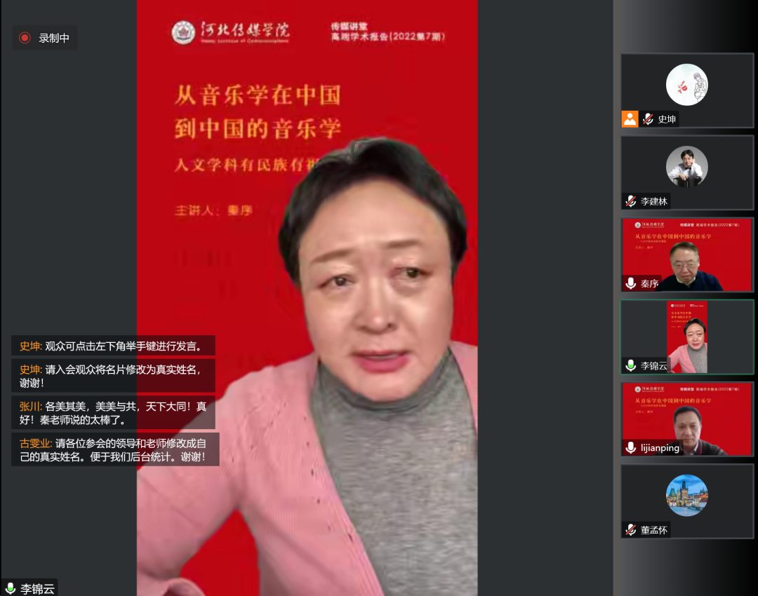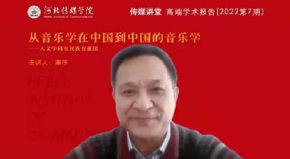 2022年12月16日,我校利用腾讯平台在线举办了2022年第7期“传媒讲堂”高端学术报告,中国艺术研究院音乐研究所秦序教授应邀作了《从音乐学在中国到中国的音乐学——人文学科有民族有祖国》的专题报告。李锦云校长出席会议并致辞。全体校领导、全体中层干部及专业建设负责人和研究生导师等170余人听取报告,河北传媒学院音乐学院院长李建林分享了自己的体会和感受。李建平副校长主持报告会。